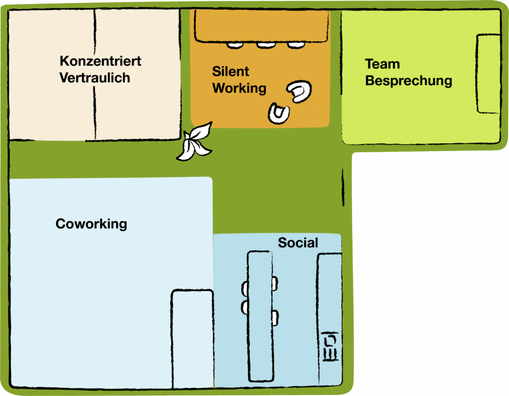 - Social Zone – Der soziale Mittelpunkt: für Pausen, Austausch und informelle Treffen.